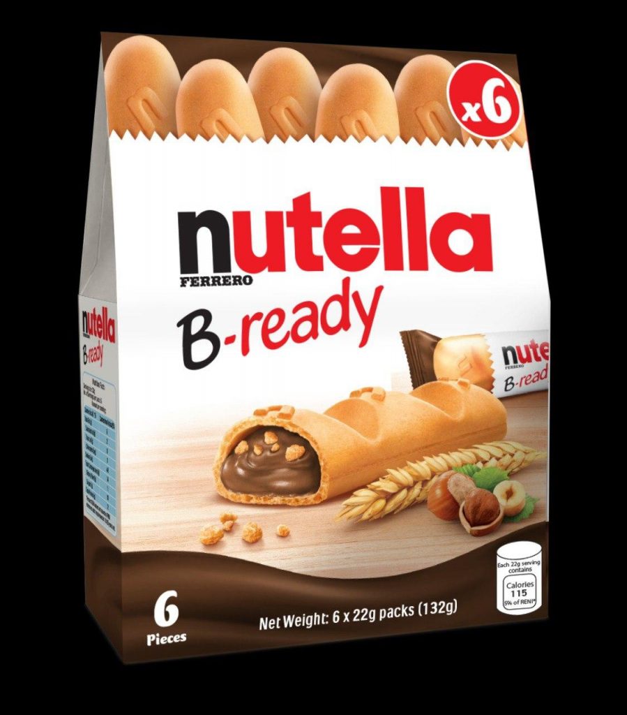 Nutella B-ready is a wafer filled snack with the original Nutella hazelnut spread with cocoa.